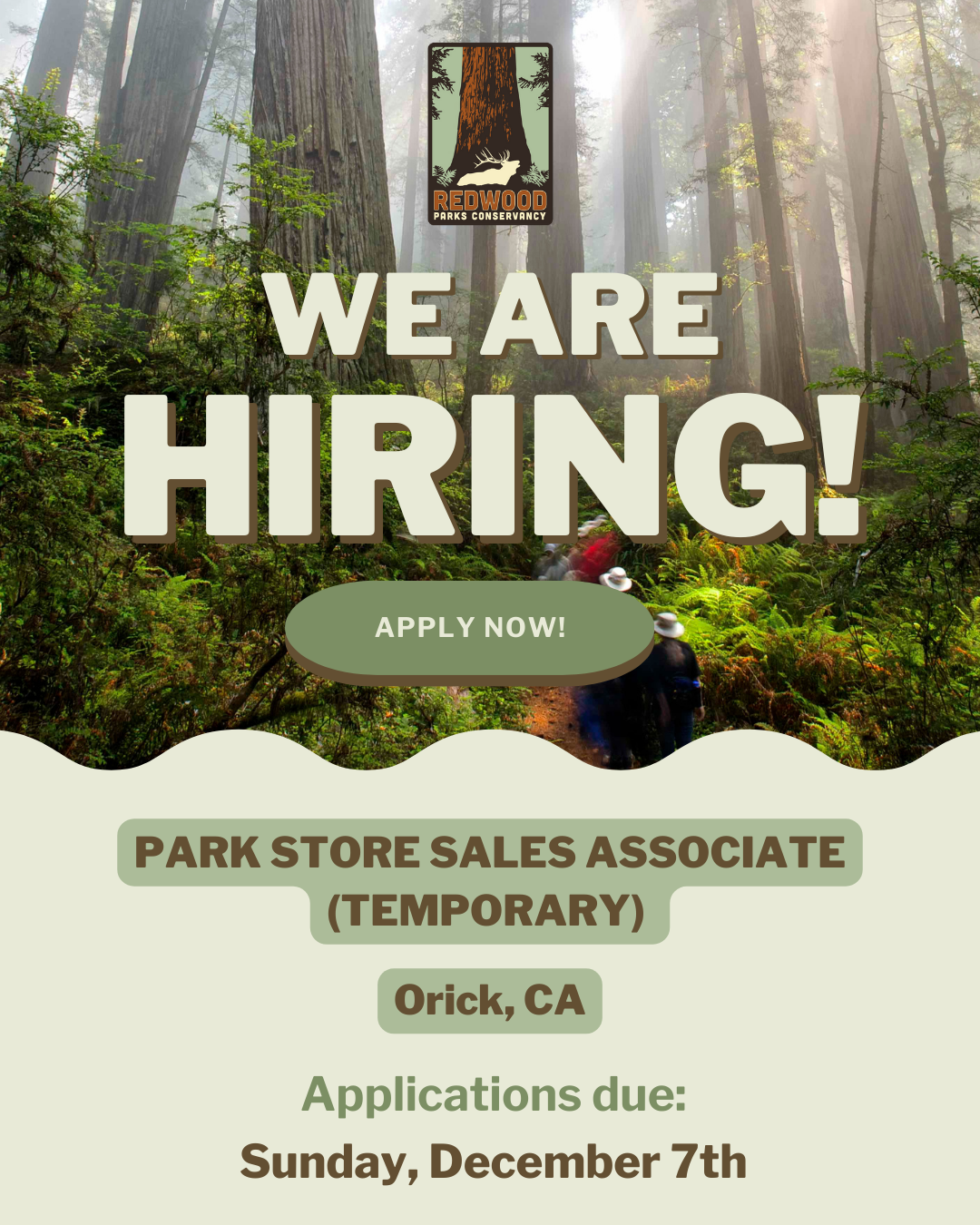 Do you enjoy spending your time in Redwood National and State Parks? Are you passionate about helping preserve these gorgeous public lands for future generations? Do you enjoy the thought of interacting with park visitors who visit our parks daily? If you answered yes to these questions, we have the perfect opportunity for you! Redwood Parks Conservancy is seeking multiple Park Store Sales Associates in the beautiful Redwood National and State Parks. We have a position available at Thomas H. Kuchel and Prairie Creek Visitor Center. This position provides support for the Fall through Spring Season 2025-2026. The position will work up to 40 hours per week, up to 120 days potentially.